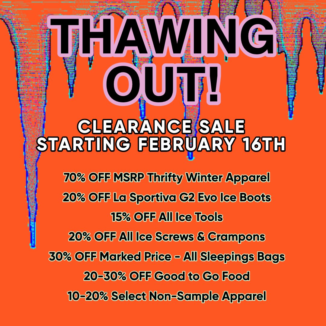 march 2-March 15/ Winter Clearance Sale: up to 30% off all Winter Apparel & up to 80% off all winter samples (including all camping samples)