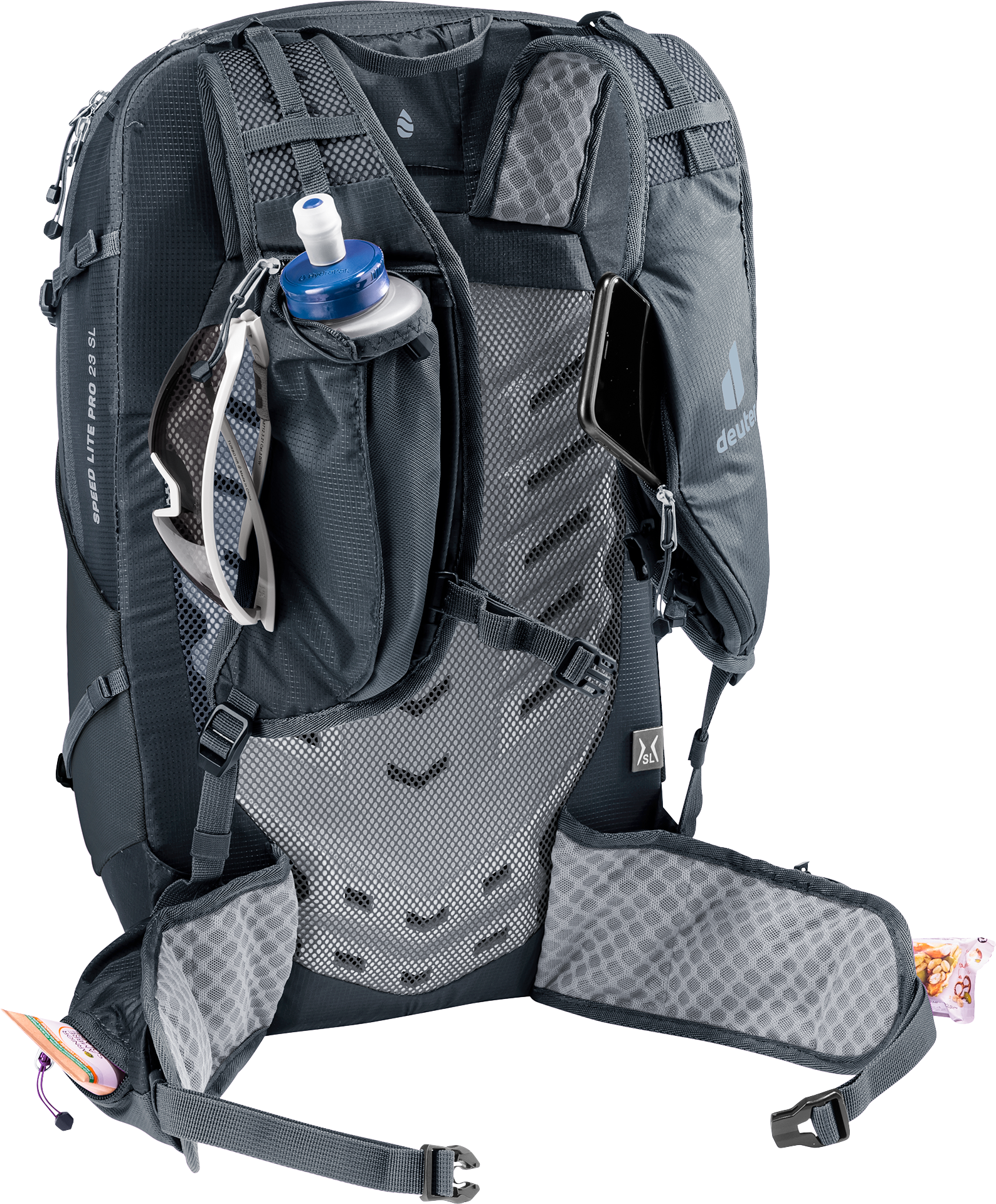 Practical mesh and zippered pockets on the inside and on the shoulder straps make it easy to organize smaller items of equipment. On the outside, a large front and two side mesh pockets made of elastic fabric provide additional storage space for a water bottle or wet clothes, for example. The front pocket also has a practical helmet holder. You can also easily attach your hiking poles to the Skyline. In wet conditions, an integrated rain cover with reflective logo offers effective protection and visibility.